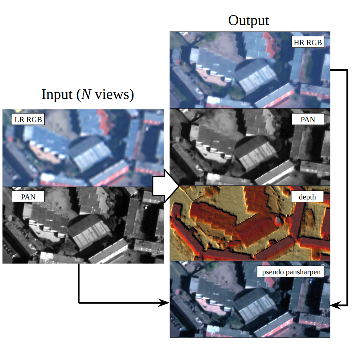 EO-NeRF is extended to handle high-res panchromatic (PAN) and low-res multispectral (MS) inputs, eliminating the need for separate pansharpening. The resulting model can render pansharpened image surrogates with high-res color information for each input viewpoint.
